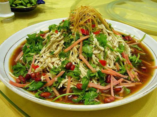 煮干絲:在乾隆時期名“九絲湯”,即干絲加火腿絲、筍絲、口蘑絲、木耳絲、銀魚絲、紫菜絲、蛋皮絲、雞絲,高檔的還要加海參絲或燕窩絲。