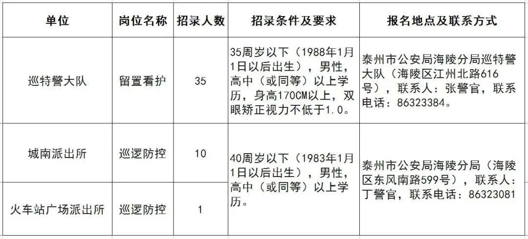 因工作需要,泰州市公安局海陵分局決定面向社會公開招錄警務(wù)輔助人員?,F(xiàn)就有關(guān)事項公告如下: