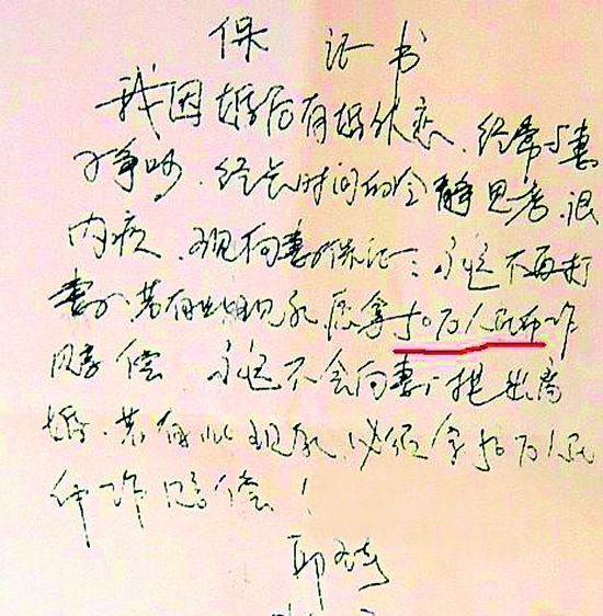 帖文稱,邱在結婚后有多次婚外情,在被發(fā)現(xiàn)后,曾經(jīng)保證不再與其他女性有不正當關系,并先后兩次寫下保證書。保證書寫道,“我因婚后有婚外戀,經(jīng)常與妻子爭吵,經(jīng)長時間的冷靜思考,很內(nèi)疚,特向妻子保證,永遠不再打妻子,永遠不會向妻子提出離婚,若有此現(xiàn)象,愿拿50萬元作為賠償。”